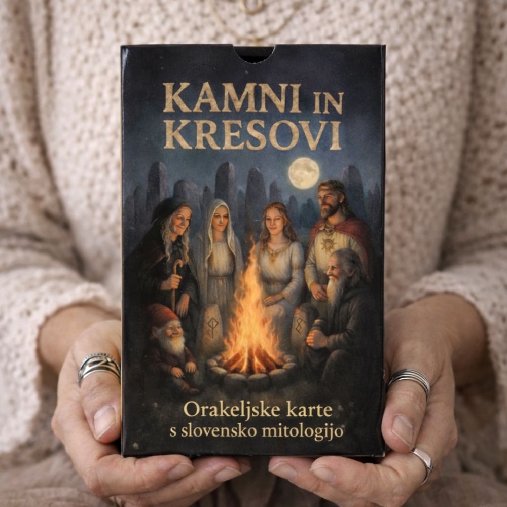 Orakeljske karte Kamni in kresovi so zasnovane na slovenski mitologiji, ki je zakladnica zgodb, bogov, boginj, bitij in arhetipov, ki so jih poznali naši predniki. V njih se zrcali modrost zemlje, gora, rek in gozdov, v katerih Slovenci živimo še danes. Ko delaš z njimi, se obračaš k energijam našega lastnega prostora – k silam, ki so stoletja oblikovale našo pokrajino, kulturo in ljudi.